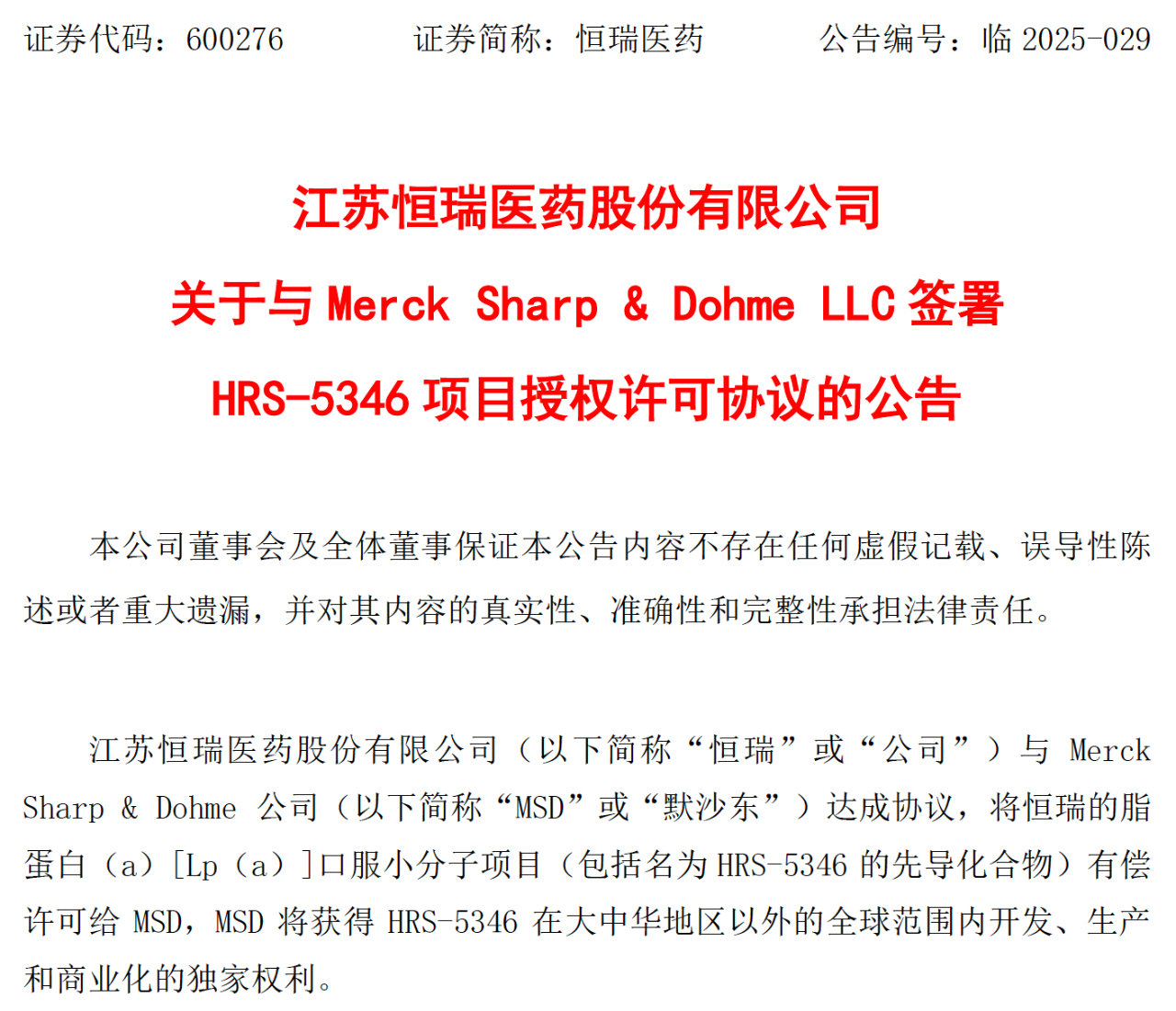 近日,恒瑞醫(yī)藥與全球醫(yī)藥巨頭默沙東就口服小分子Lp(a)抑制劑HRS-5346達(dá)成協(xié)議,該藥物在大中華區(qū)以外的全球開(kāi)發(fā)、生產(chǎn)和商業(yè)化獨(dú)家權(quán)利已成功授權(quán)給跨國(guó)藥企默沙東,恒瑞醫(yī)藥將收取2億美元的首付款,并有資格獲得不超過(guò)17.7億美元的與特定的開(kāi)發(fā)、監(jiān)管和商業(yè)化相關(guān)的里程碑付款,以及如果相關(guān)產(chǎn)品獲批上市,基于HRS-5346的凈銷售額的銷售提成。這標(biāo)志著中國(guó)本土創(chuàng)新藥研發(fā)實(shí)力再次獲得國(guó)際認(rèn)可。